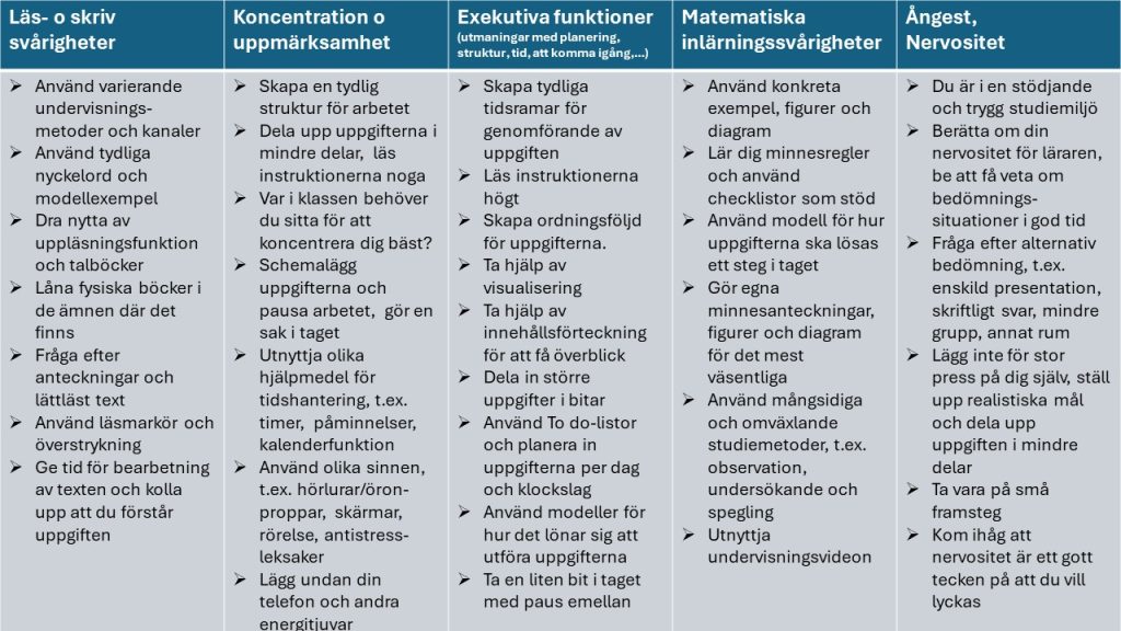 - Om stödet för lärande har testats på ett mångsidigt sätt men ändå inte är tillräckligt för att kunna slutföra gymnasiets lärokurs har den studerande rätt till mera omfattande och systematisk specialundervisning.